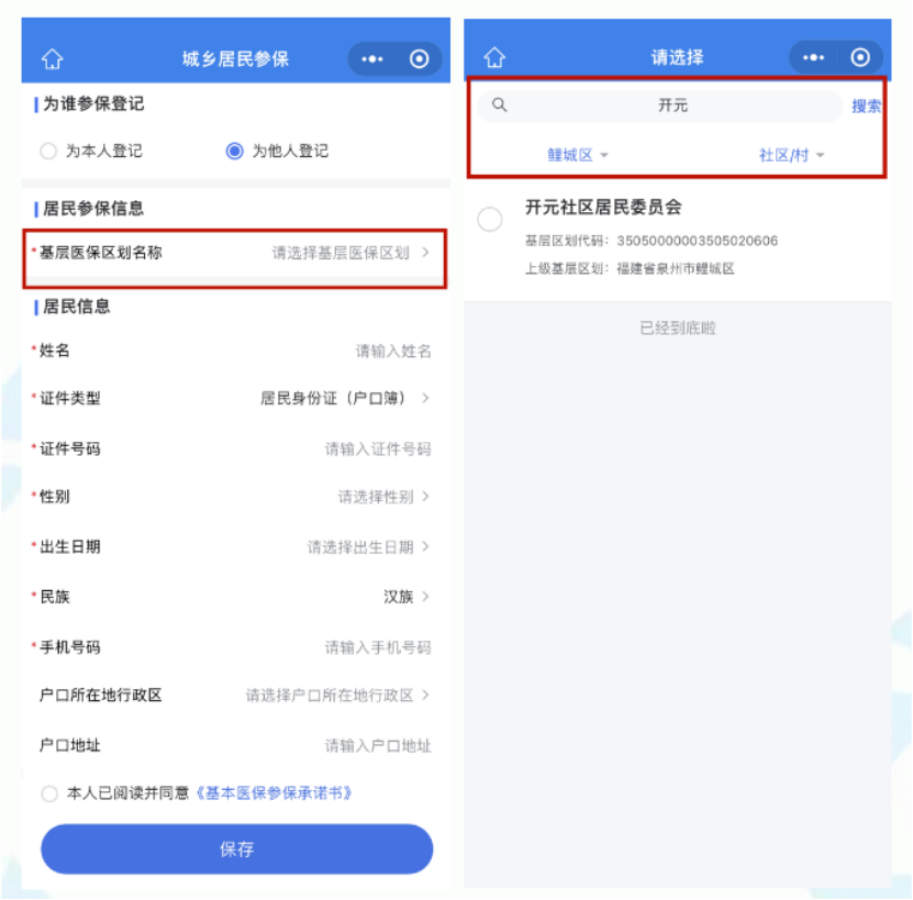 2.按要求填写基本信息(带*项为必填项),点击【基层医保区划名称】,地点切换成鲤城区,【搜索栏】填入街道名称,如户籍在“开元街道”,填写“开元”并点击【搜索】,在下拉框选定户籍所在社区,完成居民信息填写并上传户口簿首页、户主页和参保人页后保存即可。