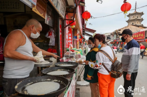泉州传统美食受到外地游客青睐。今年春节期间,来自安徽的游客在西街现场观摩制作润饼皮。
