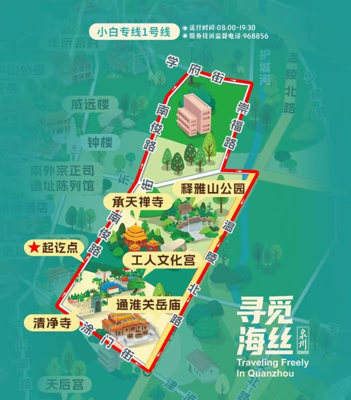 “小白”专线1号线线路走向:文化宫—南俊路—学府路—崇福路—东街—温陵路—涂门街—百源路—文化宫(单向开行)。运营时间为8:00—19:30,平均6—7分钟一班,一票制2元/人。