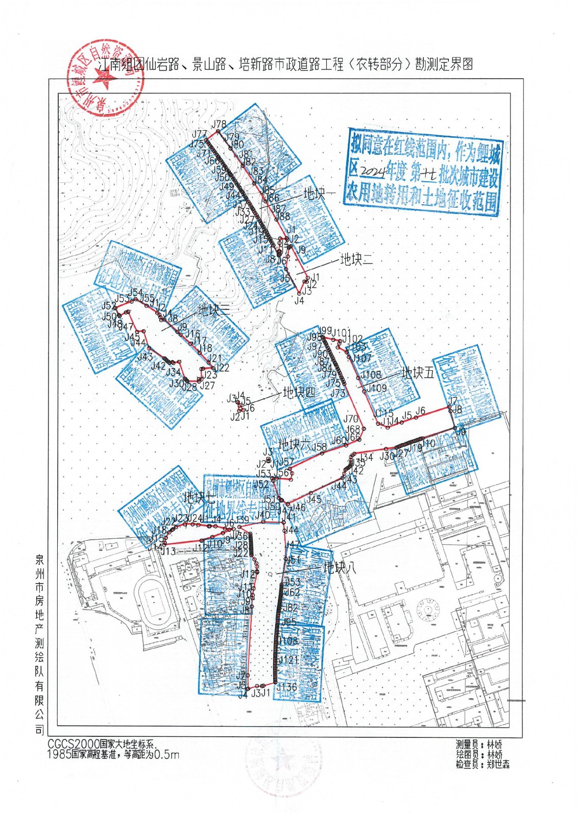 征收鲤城区浮桥街道仙景社区、金龙街道后坑社区土地面积2.3717公顷。其四至:略,详见《江南组团仙岩路、景山路、培新路市政道路工程项目农转部分勘测定界图》。