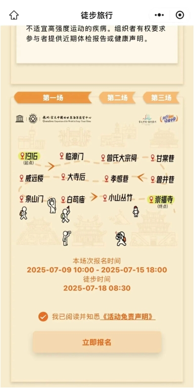查看活动信息后,至页面下方阅读《活动免责声明》,勾选“已阅读”并点击“立即报名”