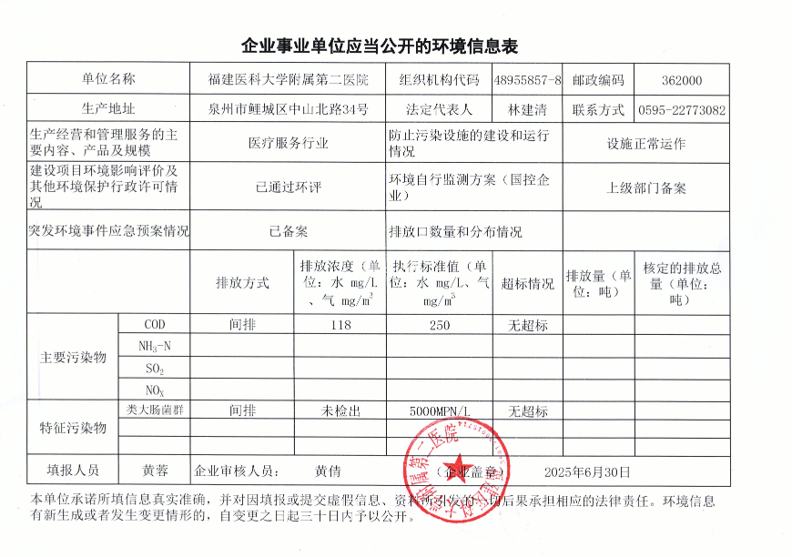 福建医科大学附属第二医院2025年第2季度环境信息表
