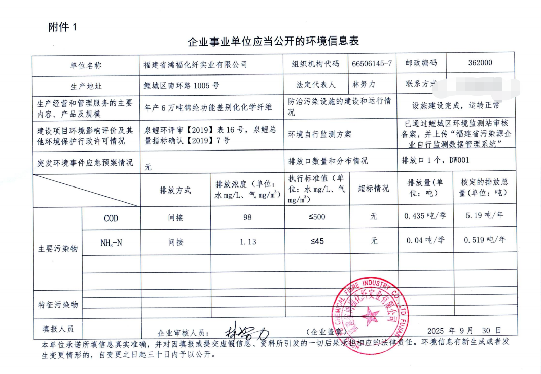 福建省鸿福化纤实业有限公司2025年第三季度环境信息公开表