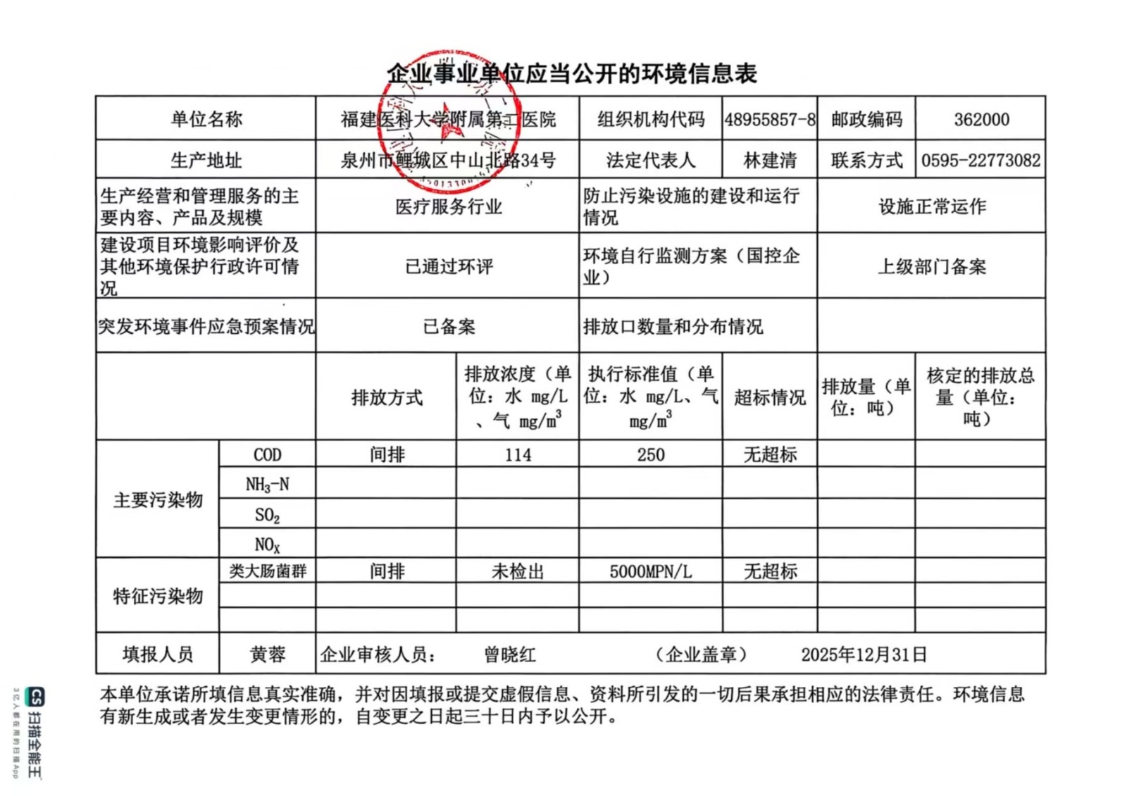 福建医科大学附属第二医院2025年第四季度环境信息表