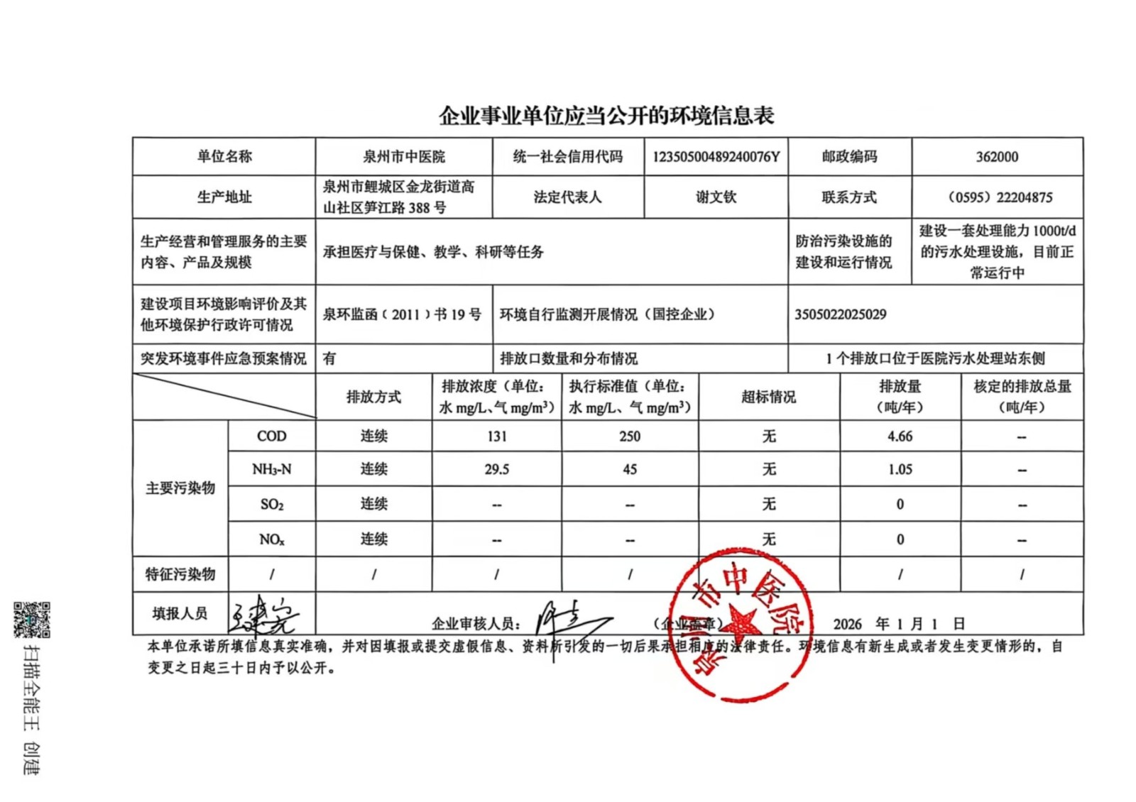 泉州市中医院2025年第四季度环境信息公开表