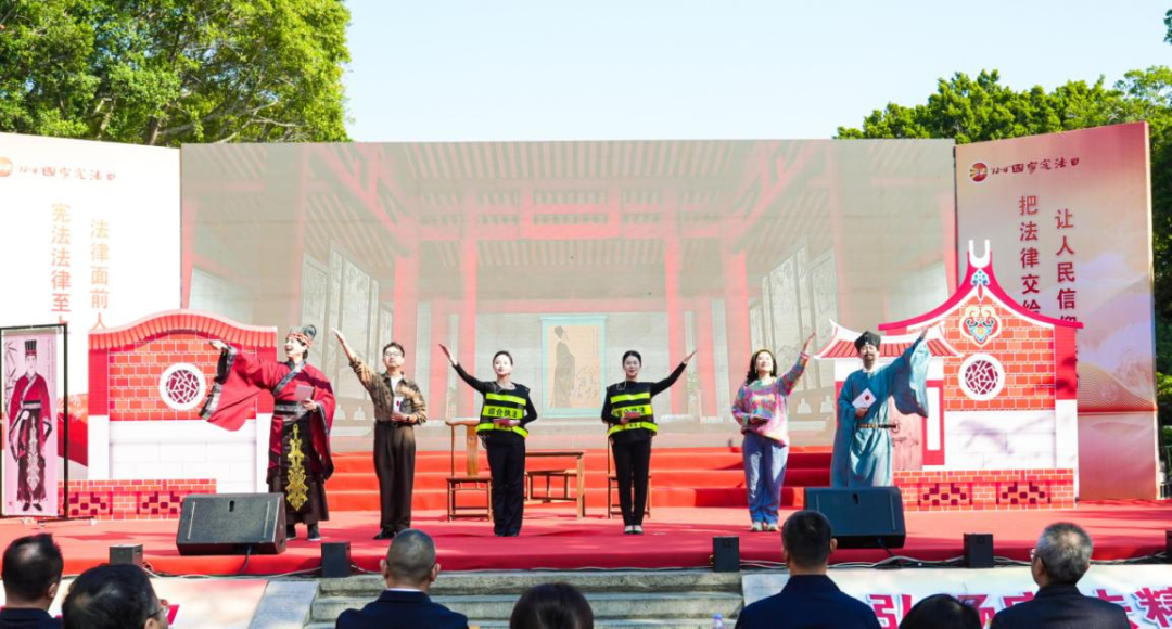 以千年府文庙为核心阵地,承办泉州市“宪法宣传周”主场活动,打造融合法治精神与闽南风情的文化盛宴。歌伴舞《不忘初心》深情回望法治初心,默剧加快板《全民反诈》幽默揭露骗局套路,情景剧《法治之光,照我古厝》巧妙讲述地方立法如何守护世遗文脉。非遗体验区创新将宪法知识融入簪花围、刻纸等本土技艺教学,同步开展宪法主题打卡、有奖抢答等互动环节,让宪法宣传更具感染力,打造出“看得见、摸得着、有温度”的世遗普法样板。