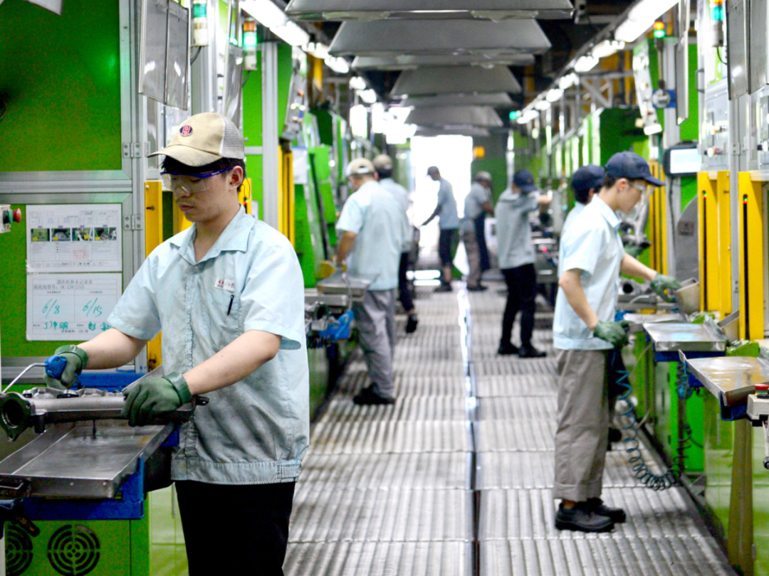在福建东南汽车城里,多条生产线全速运转,工人们专注地操作着设备,现场一片繁忙的生产景象。(石美祥 摄)