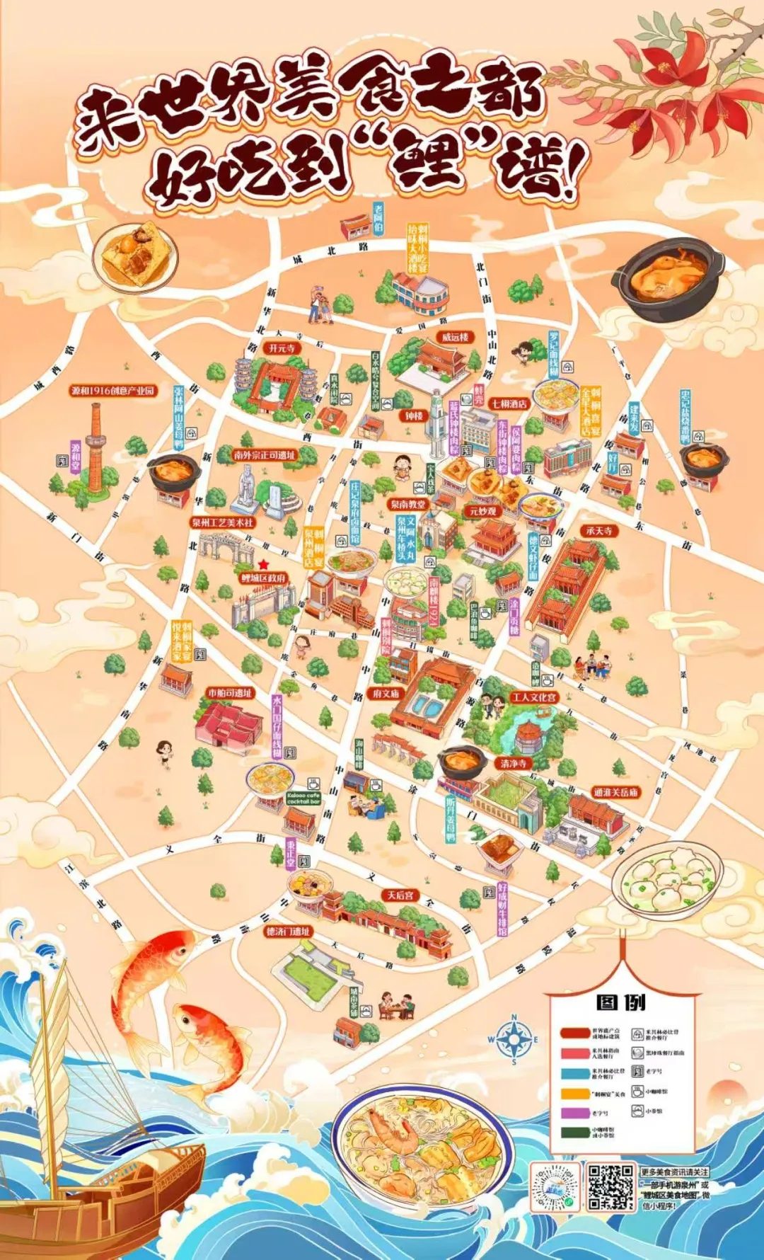整张地图以暖橙色为主调,将古城地标与美食元素有机融合。开元寺的双塔、府文庙的红墙、清净寺的穹顶等世遗地标一一呈现;手绘风格的姜母鸭、面线糊、牛排等美食插图点缀其间,传递出浓厚的闽南风味与市井烟火气;海浪、古船、锦鲤等元素融入其中,彰显泉州“海丝起点”的历史底蕴。