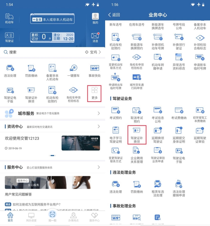 登录"交管12123"APP后,通过【业务中心】→【驾驶证补换领】,进入驾驶证补换领业务流程。