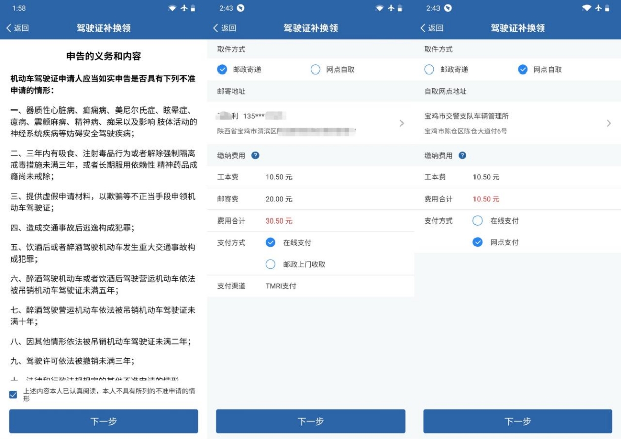第二步:认真阅读驾驶证补换领用户申告并确认后,点击【下一步】,进入取件方式、支付方式选择页面。您可以选择自取或邮寄两种方式。如自取,则需选择自取网点;如邮寄,则需填写收件地址。
