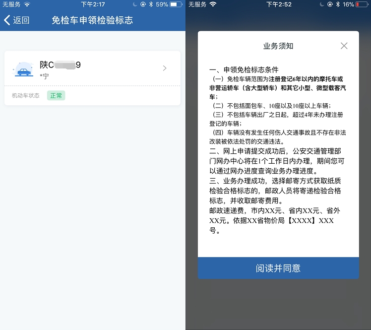 用户选择需免检车申领检验标志的机动车。认真阅读免检车申领检验标志业务须知后,点击【阅读并同意】进入车辆信息确认页面。对于交强险和车船税联网核查是否通过的,分别进入两个不同的业务操作流程。