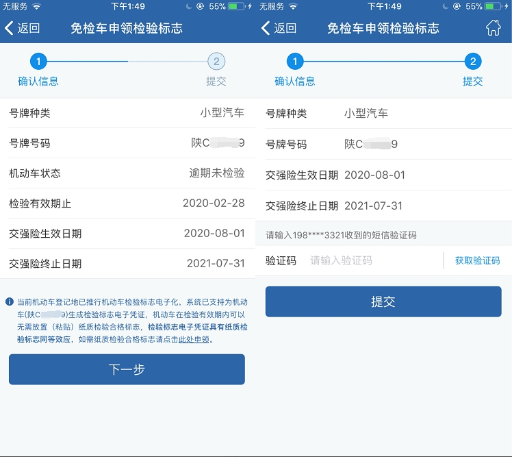 确认车辆信息页面,包括号牌种类、号牌号码、机动车状态、检验有效期止、交强险生效日期、交强险终止日期信息,点击【下一步】进入信息确认提交页面,用户再次核对免检车申领检验标志申请信息,待确认所填资料信息无误后,获取手机短信验证码,核验通过后,点击【提交】按钮,完成免检车申领检验标志业务申请信息提交。