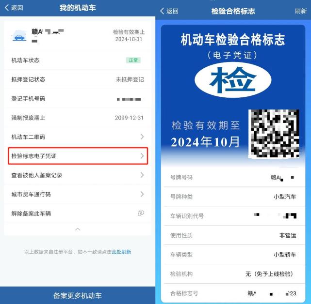 查看步骤是:登录交管12123;点击备案车辆,点击展开更多;点击检验标志电子凭证,就看到电子版的检验合格标志。上面的二维码需要用交管12123扫描才能看到结果。在检查的时候,通过交管12123出示电子标签即可。