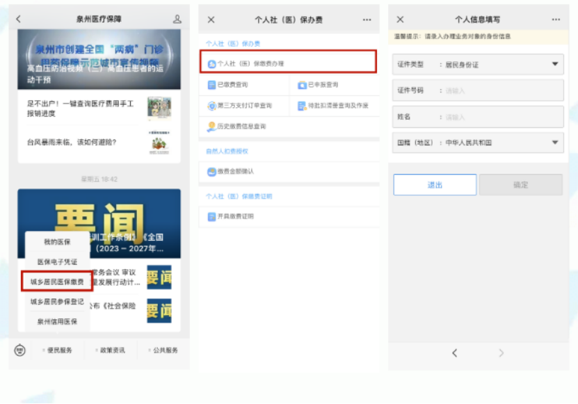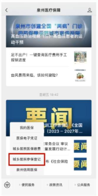 通过“泉州医疗保障”微信公众号,进入【便民服务】-【城乡居民参保登记】