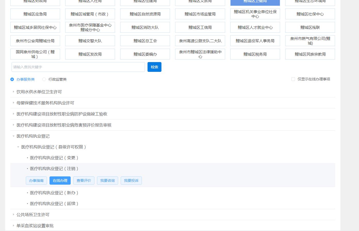 2、线上申报:登陆https://zwfw.fujian.gov.cn/选择“鲤城区”,按“我要办”-“部门服务”-“鲤城区卫健局”步骤查询需办理事项,点击“我要申报”。