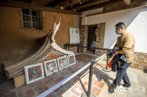 游客在古城台魁巷7-1号举行的泉州传统民居营造技艺展观看燕尾脊屋顶和泥塑