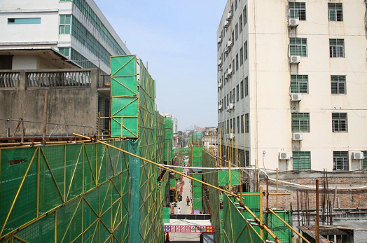 5月7日上午,在鲤中街道通政社区花巷“第五立面”改造现场,记者看到,巷内两侧已搭建好施工脚手架,工人正在拆除部分建筑屋顶的铁皮搭盖、违规构筑物。
