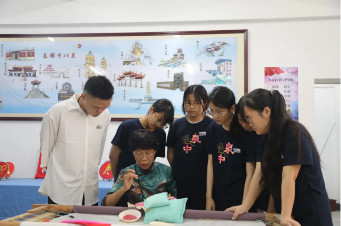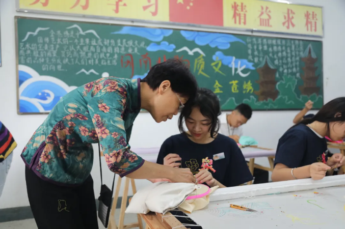 2018年起,泉州市泉中职业中专学校服装设计与工艺专业将非遗项目引进课堂,开设了珠绣课程,聘请泉州市珠绣技艺代表性传承人陈克忍前来教授。今年是中国共产党成立100周年,该校将党史学习教育融入珠绣课程,让学生们在学习刺绣的过程中,把对党和祖国的热爱用针线绣出来。