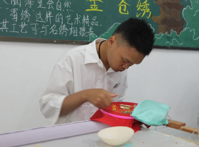 一根细针、两只巧手、数条丝线……在泉州市泉中职业中专学校的珠绣课上,服装设计与工艺专业的学生们端坐在绣架前,双手一举一落,眼前的绣布上,党徽、南湖红船等红色元素在针线穿梭间慢慢清晰。