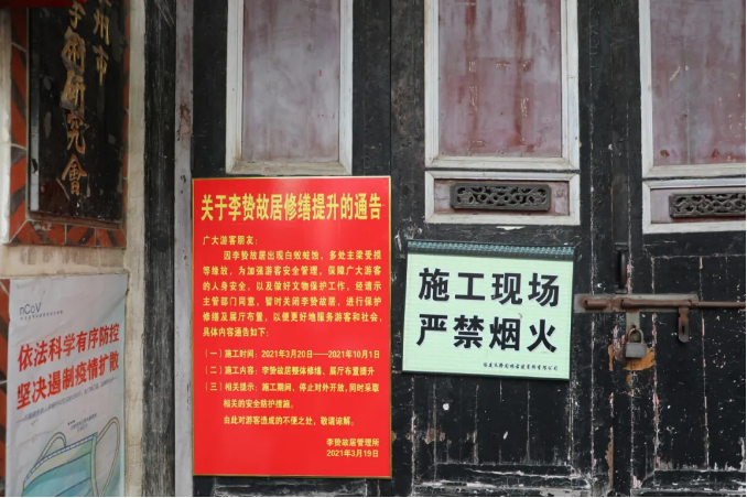 8月23日下午,记者来到位于鲤城区万寿路123号的李贽故居,只见故居大门关闭,门上除张贴着“施工现场 严禁烟火”警示牌,还贴着一份修缮提升通告。通告提到,因李贽故居出现白蚁蛀蚀,多处主梁受损等缘故,为做好文物保护工作,切实保障市民、游客人身安全,暂时关闭李贽故居,进行保护性修缮及展厅布置,施工时间为今年3月20日至10月1日。施工期间,停止对外开放,敬请广大市民、游客谅解。