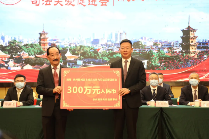 随后,现场举行捐赠仪式。据悉,一段时间来,促进会的爱心捐赠活动得到了机关团体、企事业单位、社会各界人士的积极响应和广泛支持。截至今天,共收到来自社会各界的捐赠91份,捐款总额超1000万元。其中,泉州通淮关岳庙董事会捐赠300万元;福建省集英保安集团董事长陈超群先生捐赠100万元;泉州府城隍庙、福建省立信换热设备制造股份公司吴志强分别捐赠50万元。