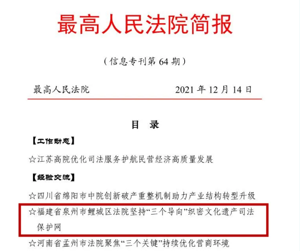 近日,最高人民法院简报以“福建省泉州市鲤城区法院坚持‘三个导向’织密文化遗产司法保护网”为题,报道鲤城法院在文化遗产司法保护方面的工作举措和成效。