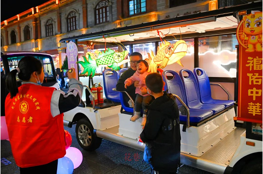 据介绍,以往花灯都是挂在固定的点位等待市民前来观赏,今年,为了避免群众聚集赏灯,古城通过公交“小白”将传统花灯带到市民身边。