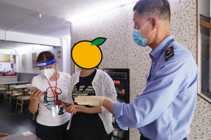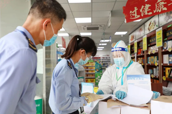 除了餐饮店,药店也是此次检查的重点之一。记者跟随检查人员来到国大药房鲤城南俊路分店,只见药店在门口设立隔离柜台,最大限度减少人员接触,药店员工均身穿防护服,佩戴好口罩和隔离面罩,为每位购药的顾客测量体温,并引导其扫张贴码。