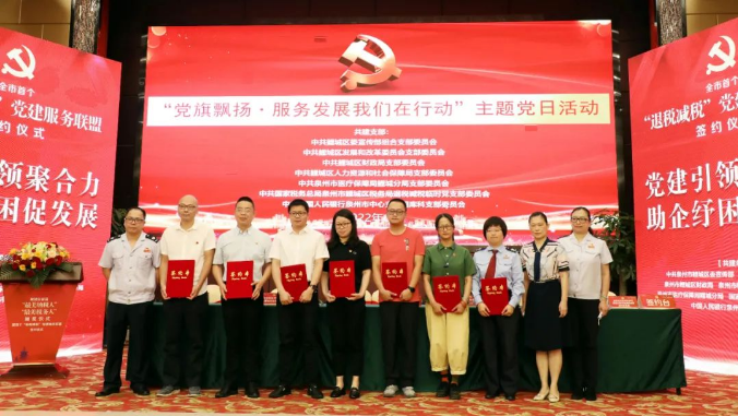 活动现场,鲤城区委宣传部组合党支部、鲤城区发展和改革局党支部、鲤城区财政局党支部、鲤城区人力资源和社会保障局党支部、泉州市医疗保障局鲤城分局党支部、国家税务总局泉州市鲤城区税务局退税减税临时党支部、中国人民银行泉州市中心支行国库科党支部等7个部门党员代表共同签订党建服务联盟协议书,标志着全市首个“退税减税”党建服务联盟正式成立。