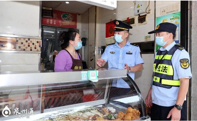 鲤城区城市管理综合执法工作人员在商家检查指导工作