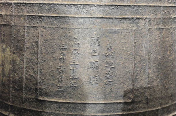 据介绍,该钟为铁铸钟,通高120厘米,钟口直径70厘米,胎体厚5厘米,重约350公斤,虽历时年代久远,因一直悬挂于泉州通淮关岳庙正门左侧房梁,未经风吹雨淋及日晒,整体保存良好。古钟正面铭文“在城迎春门 关王庙钟 万历三十二年 三月吉日立”,字样清晰可见。