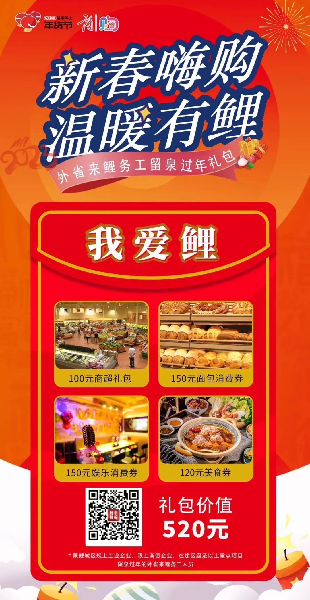 活动内容:依托“幸福鲤城”平台,向全区规上工业企业、限上商贸企业、在建区级及以上重点项目留泉的外省来鲤务工人员,每人发放价值520元的“我爱鲤”礼包,礼包中包含价值100元的商超礼包、150元面包消费券、150元的娱乐消费券、120元美食券,引导“新鲤城人”留泉欢乐过年。