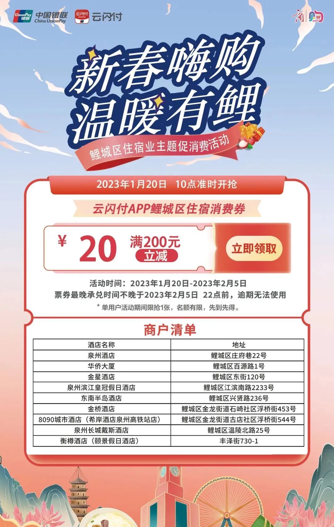 活动内容:1月20日起联合限上酒店通过云闪付APP发放新春酒店专题消费券(满200元减20元)。活动期间用户登录云闪付APP,访问云闪付主页面“鲤城区新春主题促消费”活动页面,查看并领取消费券。领券成功后,在活动企业内消费,满足最低金额要求,使用云闪付APP付款码或云闪付扫一扫功能,达到相应使用标准后,即可核销。每名消费者活动期间限制领取一次消费券,每单限制使用一张消费券。消费券适用活动企业中的住宿、餐饮消费,并可以在商家原有优惠基础上叠加使用。