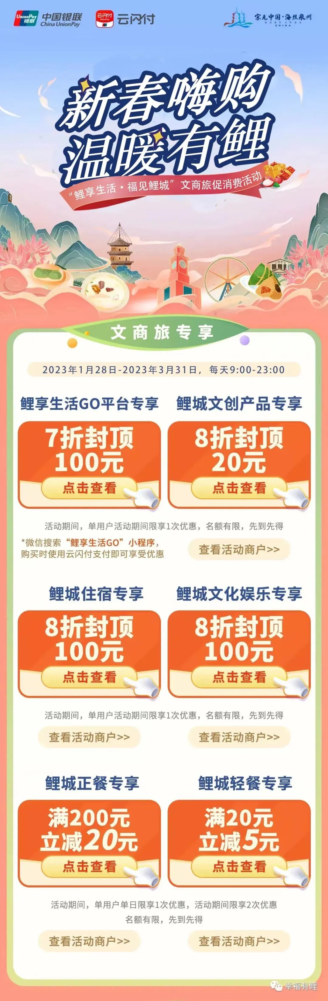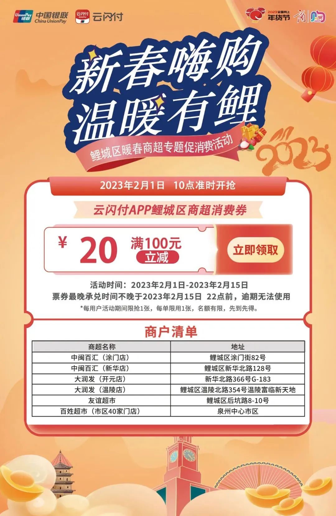 活动内容:2月1日起联合全区限上商超通过云闪付APP发放暖春商超专题消费券(满100元减20元)。活动期间用户登录云闪付APP,访问云闪付主页面“鲤城区新春主题促消费”活动页面,查看并领取消费券。领券成功后,在活动企业内消费,满足最低金额要求,使用云闪付APP付款码或云闪付扫一扫功能,达到相应使用标准后,即可核销。每名消费者活动期间限制领取一次消费券,每单限制使用一张消费券,并可以在商家原有优惠基础上叠加使用。