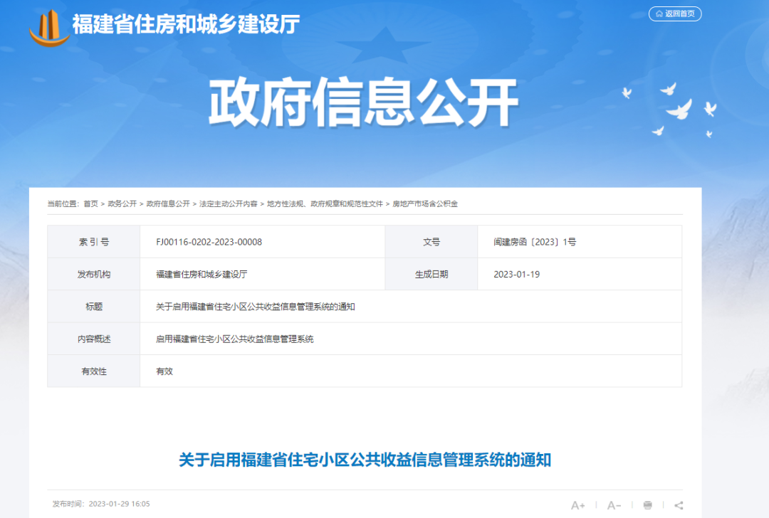 为加强和改进住宅小区公共收益监管工作,提升我省物业管理监管信息化水平,省厅组织开发了福建省住宅小区公共收益信息管理系统(以下简称“省公共收益系统”),决定于2023年1月20日起正式启用。有关事项通知如下:
