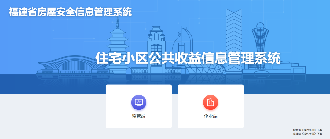 所有用户均使用闽政通用户(福建省社会用户实名认证和授权平台用户)登录,登录方式如下:福建省住房和城乡建设厅官网-福建省住房和城乡建设厅综合监管服务平台-住房建设-福建省房屋安全信息管理系统(住宅小区公共收益信息管理系统)。