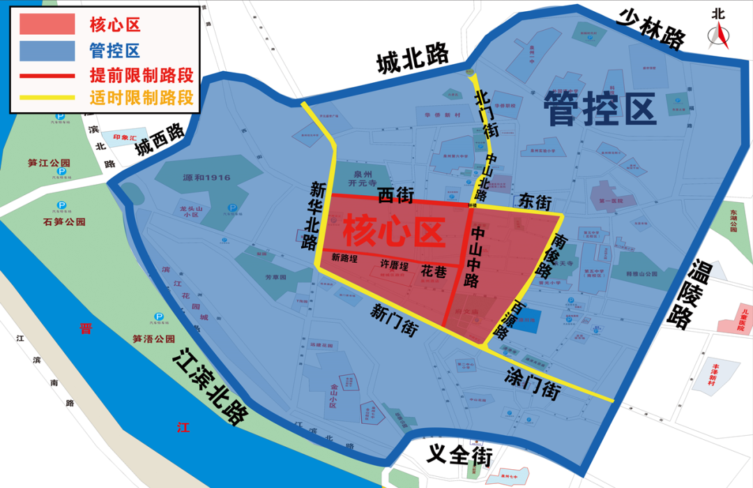 城西路、城北路、少林路、温陵路、义全街、江滨北路合围区域管控区内将根据交通流量情况,适时采取分流管控措施。