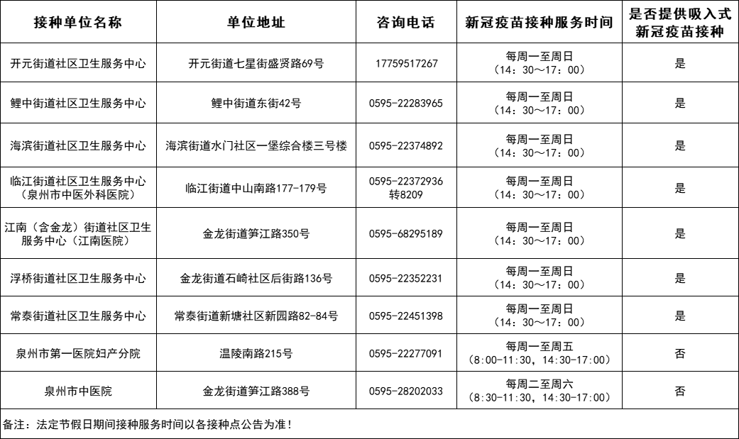 当前,鲤城仍在积极推进新冠疫苗接种工作,在全区设置9家新冠疫苗接种点,其中“吸入式”新冠疫苗接种点7家,现阶段,疫苗储备充足,符合接种条件的市民群众无需预约,可“随到随种”。区卫健局建议符合接种条件的人群,尤其是60岁以上老年人,尽快接种。