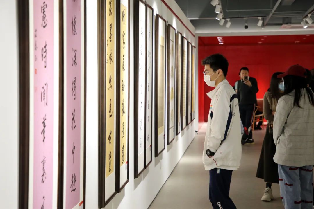江柏雄是泉州现代中学高二年级的书法生,即将准备艺考集训,书法老师特地带他来看展学习。“展览上有不少学姐们的作品,我观察了这些书法的字形结构和笔墨变化,感觉颇有收获。”