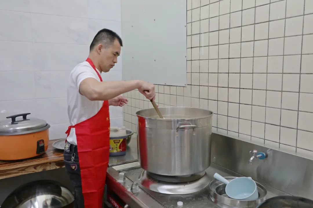切菜、洗菜、煮面……临近饭点,大家忙碌的身影在厨房里穿梭,当天的卤面由李乔旋掌厨,煮面的大锅里冒着热气,阵阵香味在空气里飘散,虽是素食,但香菇、萝卜、白菜、芋头、木耳、葱花等配菜十分丰富,可谓色香味俱全。“目前,食堂主要提供卤面、炒米粉、炒饭、八宝粥等简餐,每天大概可提供七八十份。”李乔旋告诉记者。