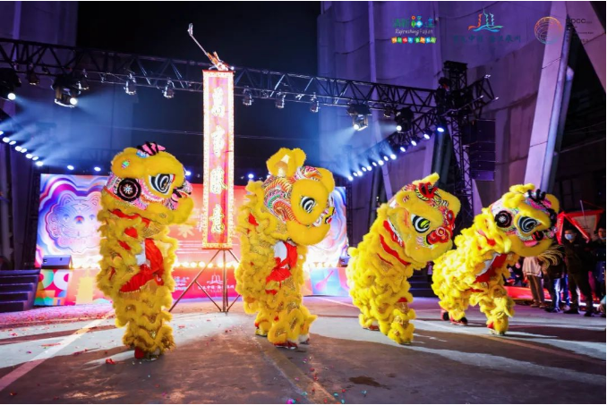 当晚七点半,伴随着阵阵鼓声,四头威风凛凛的醒狮率先出场,大鼓凉伞、闽南青狮、山后五音吹、电音三太子、新兴英歌舞、舞龙舞狮队等非遗民俗表演队伍紧随其后,以方阵的形式,绕着园区一路巡游踩街,精彩的表演引得观众阵阵喝彩。