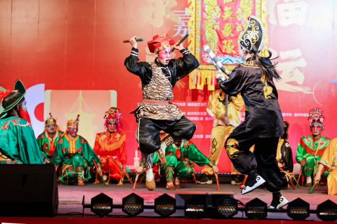 热闹的游园活动结束后,非遗民俗表演队伍齐聚大麦仓,轮番上阵、同台竞演,共同展现非遗魅力。据悉,此次活动共邀请了11支非遗民俗表演队伍,其中既有南音、拍胸舞、五祖拳等泉州非遗,也有广东潮汕地区的龙狮队、新兴英歌舞等,两地文化的交流,碰撞出别样精彩,令现场观众大饱眼福、直呼过瘾。