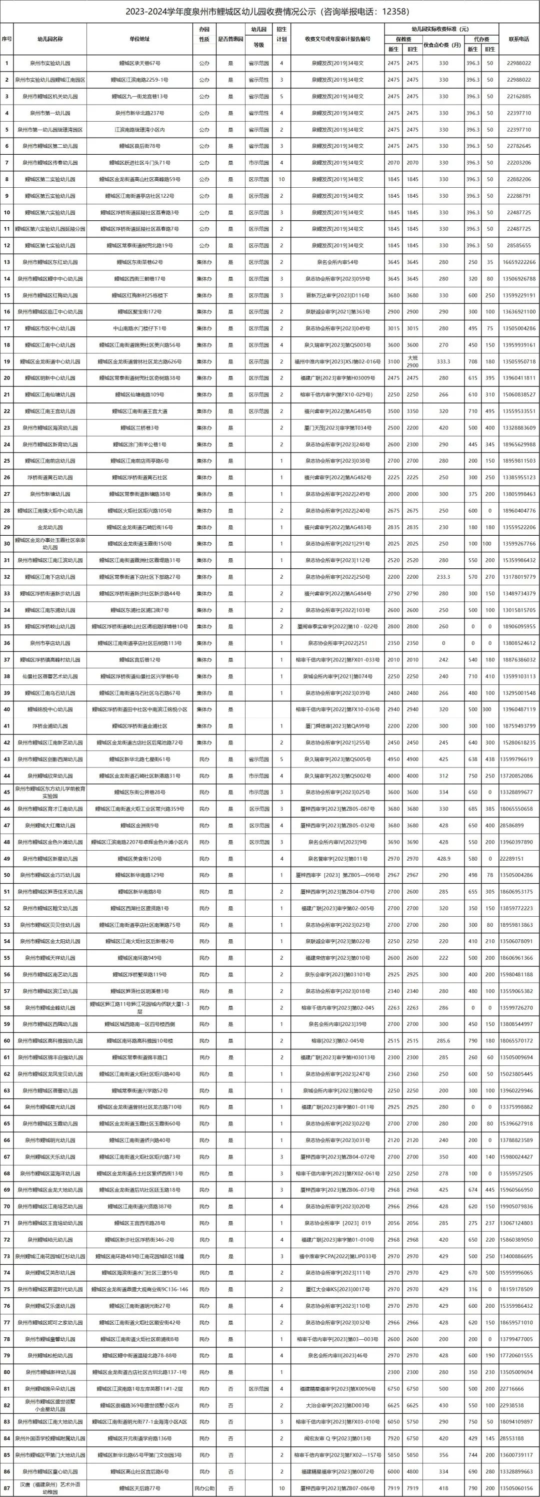 2023-2024学年度泉州市鲤城区幼儿园收费情况公示