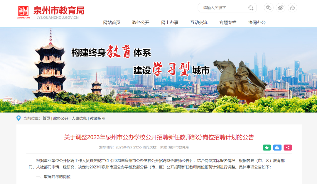 根据事业单位公开招聘工作人员有关规定和《2023年泉州市公办学校公开招聘新任教师公告》,结合岗位实际报名情况,根据各县(市、区)教育部门、人社部门申请,经研究,决定对2023年泉州市直公办学校及部分县(市、区)公开招聘新任教师岗位招聘计划进行调整。具体事项公告如下: