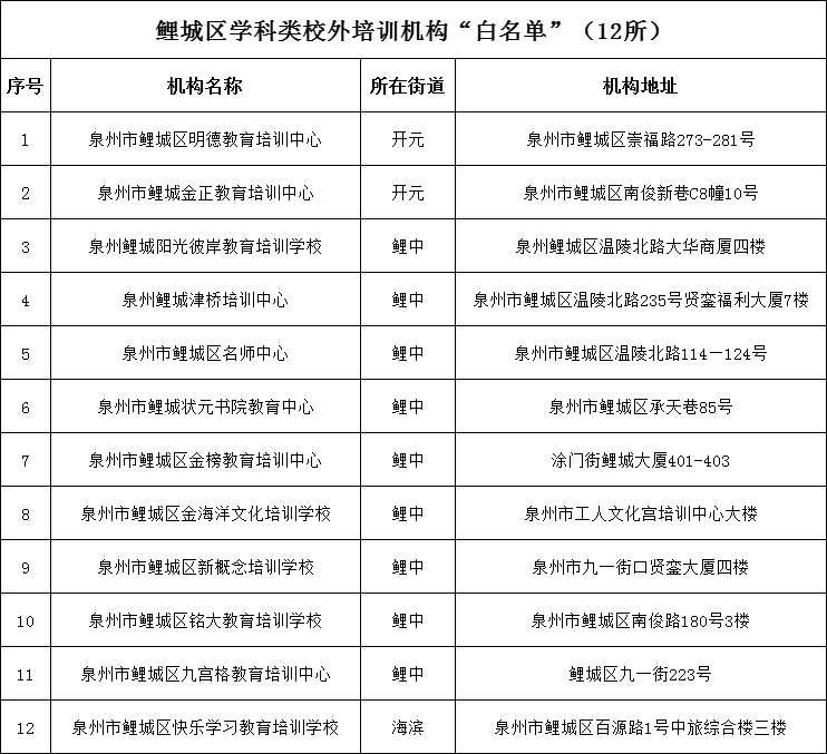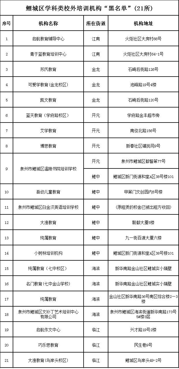日前,鲤城区教育局公布辖区学科类校外培训机构最新“黑白名单”。其中,列入“白名单”的培训机构共计12所;列入“黑名单”的培训机构共计21所,均未获得办学许可证和营业执照。