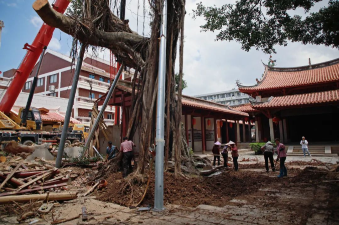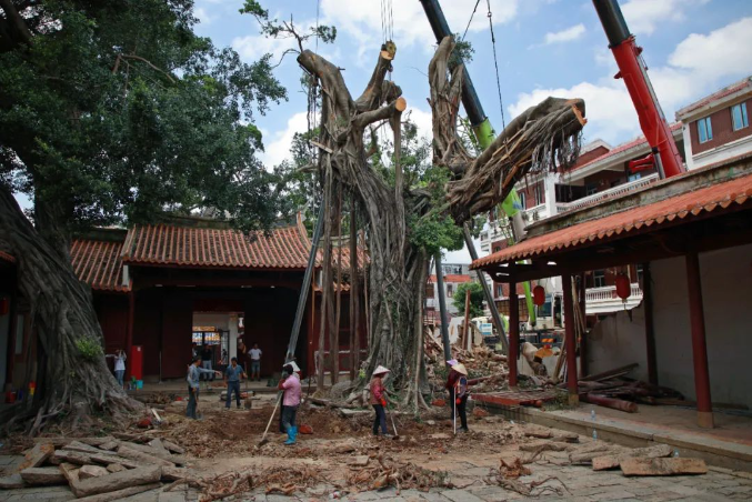 8月2日上午,记者来到泉州六中内小城隍,只见两部大型吊车伸长机械手臂,通过几条钢缆,将倒伏的古榕树缓缓吊起扶正,重新植入原来的树穴内,树身用三根钢管临时加固,七八名工人正用细沙将树根底部的缝隙填满,固土培根。