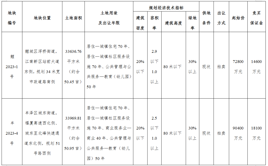 鲤2023-1号、丰2023-4号地块国有建设用地使用权出让公告