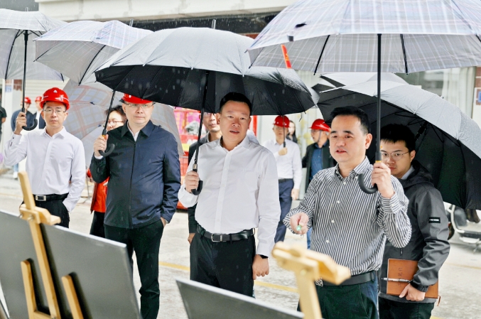 在王宫华侨历史文化街区项目现场,黄辉灿认真察看项目建设情况,详细了解项目建设进度。该项目位于江南街道王宫社区,项目总用地117亩、总投资5亿元,包含王宫街区整治改造建设和华侨国际体育文化交流基地两个子项目。当前,该项目已先行启动示范段施工,各项工作正有序推进。