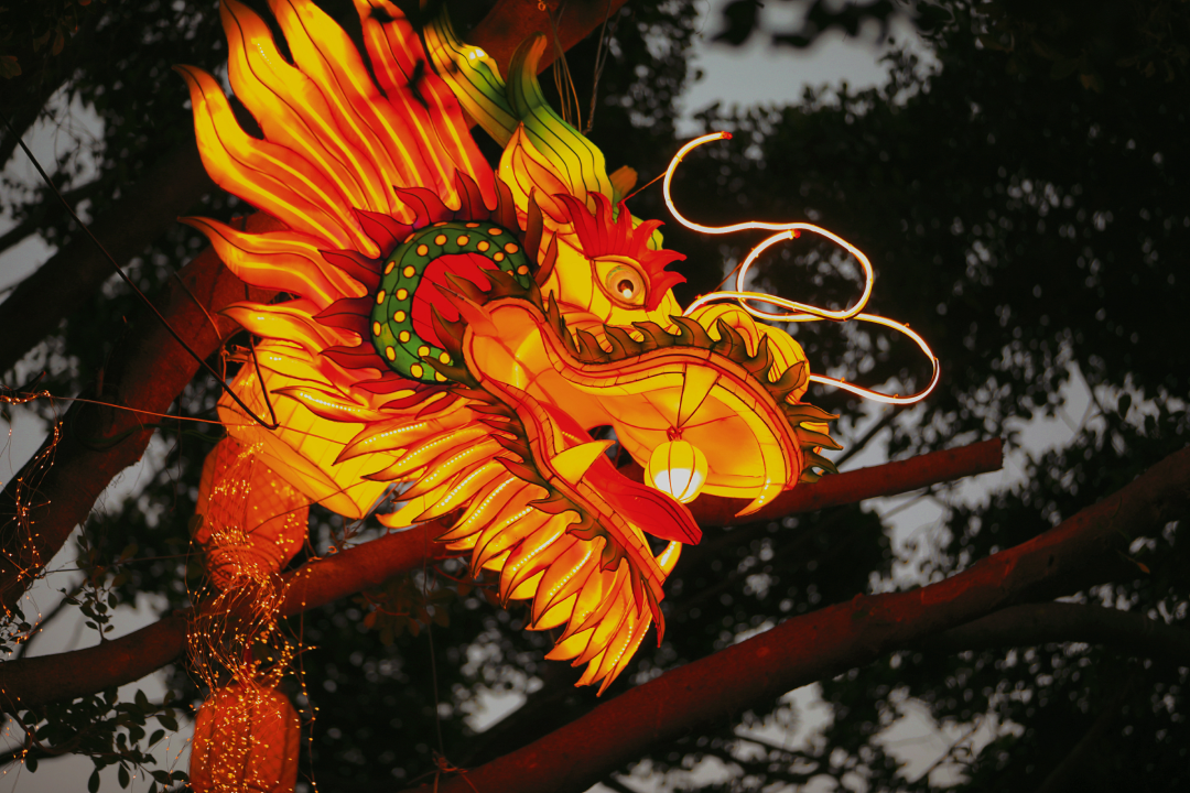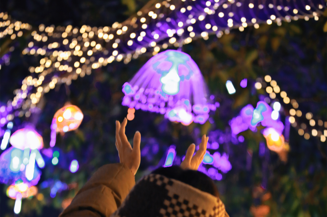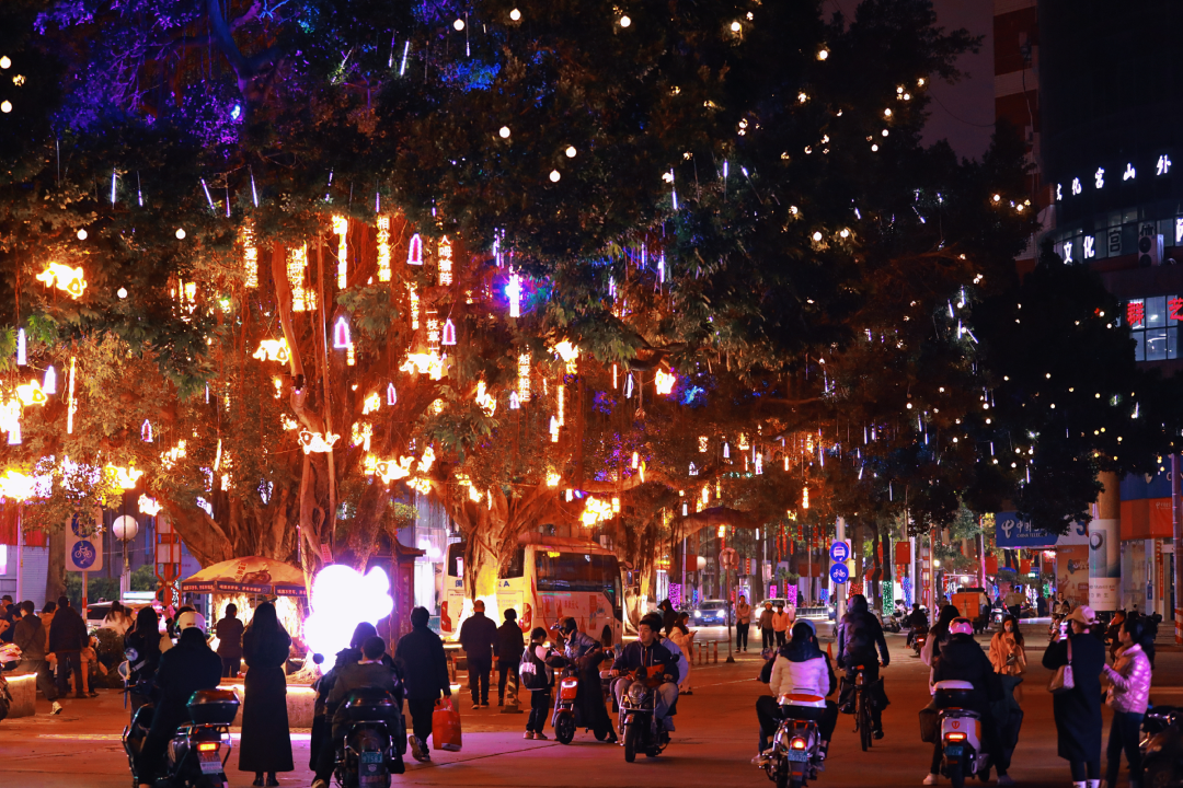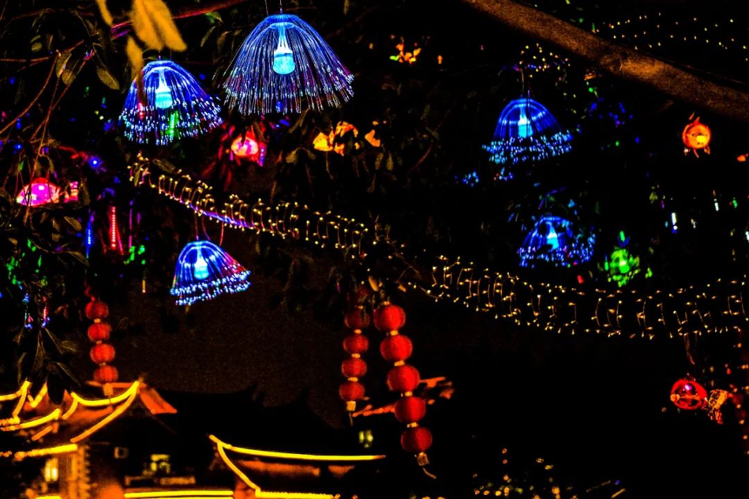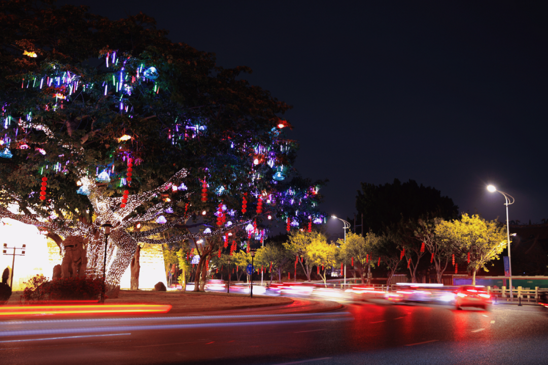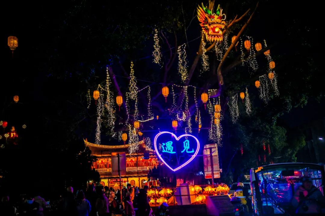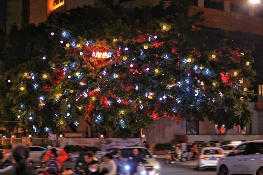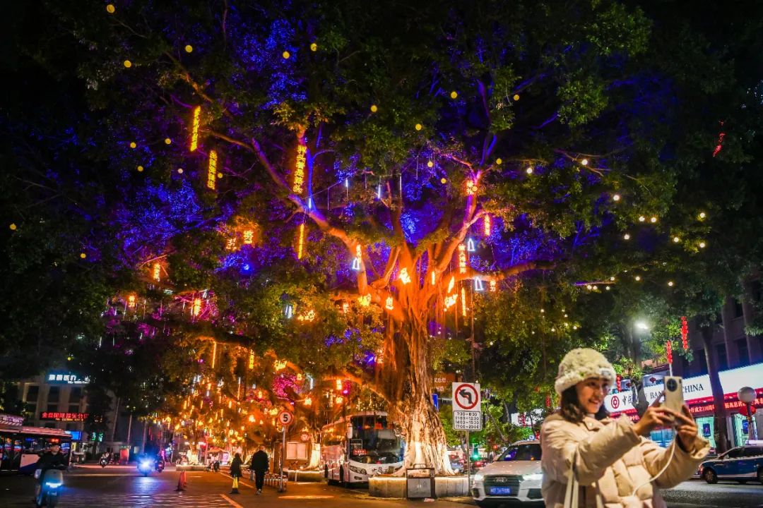 “爱拼才会赢”“输人呣输阵”“坐船爱船走”……在九一街文化宫出入口停车场,六株大树上,一串串闽南俚语以文字投影、发光字体、IP卡通灯箱等形式具象化,搭配生动有趣的读音、注释,让市民群众和游客朋友在观赏的同时,沉浸式感受深厚的闽南文化。此外,树身还悬挂了大量染树灯搭配定制球泡灯、鲤鱼亚克力灯、东西塔异形灯等加以点缀,远远望去一派火树银花的景象。
