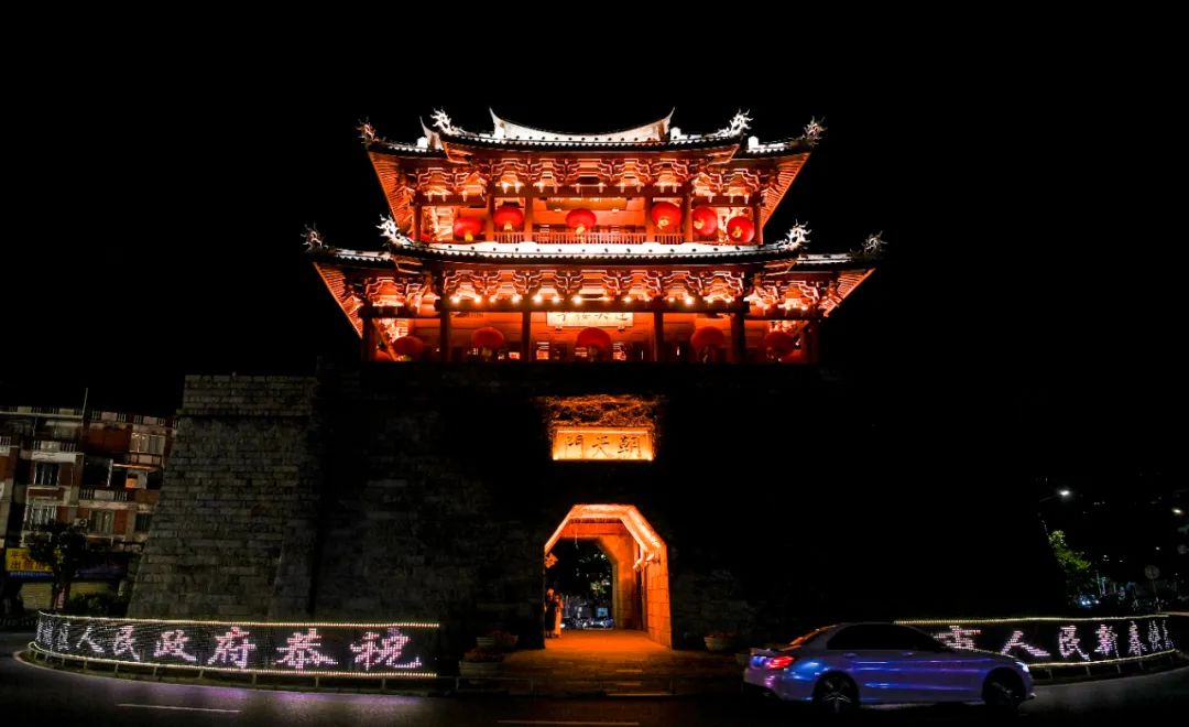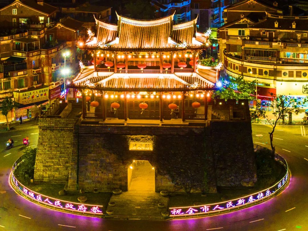 在城西路朝天门,这座古老的城门旁,一个充满科技感的亮化装置应运而生——以朝天门为圆心,以花坛为舞台,360°旋转展示着来自鲤城的新春祝福。当夜幕降临,城楼灯光与发光文字交相辉映,营造出浓厚的节日氛围。